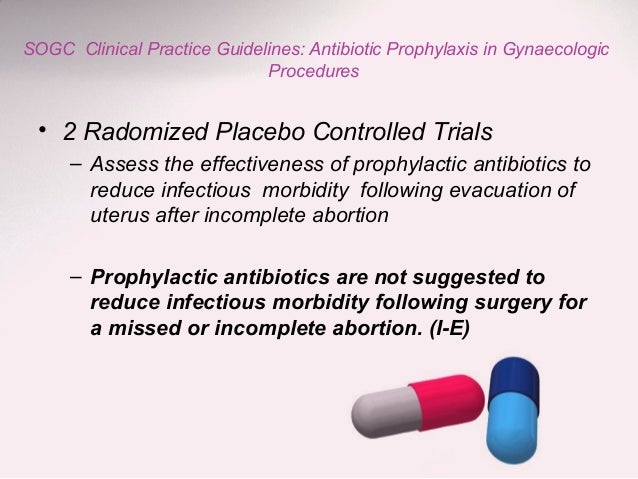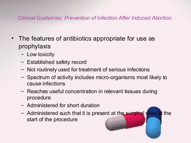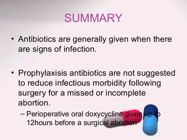 We found 19 randomised controlled trials that looked at the effect of antibiotic prophylaxis on post-abortal upper genital tract infection amongst women requesting induced abortion. 100 mg orally 1 hour before procedure and 200 mg orally after. Abortion pill is the common name for using two different medicines to end a pregnancy. To prevent this a course of antibiotics is given. Antibiotics to prevent infection. First you take a pill called mifepristone. Similarly the available evidence did not suggest that penicillin plus chloramphenicol is better than cephalothin plus kanamycin for the treatment of women with septic abortion.