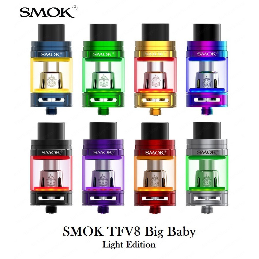 SMOK TFV8 Big Baby Beast Light Edition Sub-Ohm Tank. When you fire the device to vape the LED will light up and change its color along with the color of sealing ring. This product is intended for use by persons 21 or older and not by children women who are pregnant or breast feeding or persons with or at risk of heart disease high blood pressure diabetes or taking medicine for depression or asthma. Smok TFV8 Big Baby Light Edition Tank w Color LED. SMOK is one of the most coveted and well-respected members of the vaping community. A Review for the SMOK TFV8 Big Baby LIGHT Edition I know a handful of Vapers that use the SMOK Big Baby SMOK Big Baby exclusivelyI can give them other tanks to try like the Uwell Valyrian or even the new TFV12 Prince but these fine folks always find themselves back to the Big Baby Tank. The SMOK TFV8 Big Baby Light edition tank is a sturdy stainless steel construction with a prominent base and top cap. The TFV8 Big Baby Light Edition provides a phenomenal offerings between flavor experience to cloud-chasing performance with the utilization of the Baby Turbo Engines coil family. The SMOK S-PRIV 225W TC Starter Kit presents a spooky chassis with 12-Color LED in the Skull Eyes design while utilizing the cloud-chasing performance of a SMOKTechs premier chipset to pair with the Light Edition of the TFV8 Big.