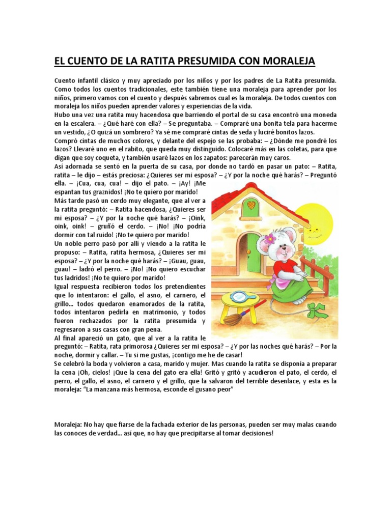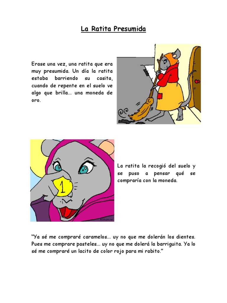Había una vez una ratita que era muy presumida. 2 Ratita presumida pal ESP v7Ratita presumida pal ESP 21612 1128 Página 2. El cuento de la ratita presumida es uno de los clásicos cuentos infantiles que llego a tener aceptación para su aprendizaje moralista y de valores este cuento corto es del autor charles perrault literato importante que logro grandes obras el aprendizaje que quiso dar a conocer a través de esta historia es la de pensar muy bien las.